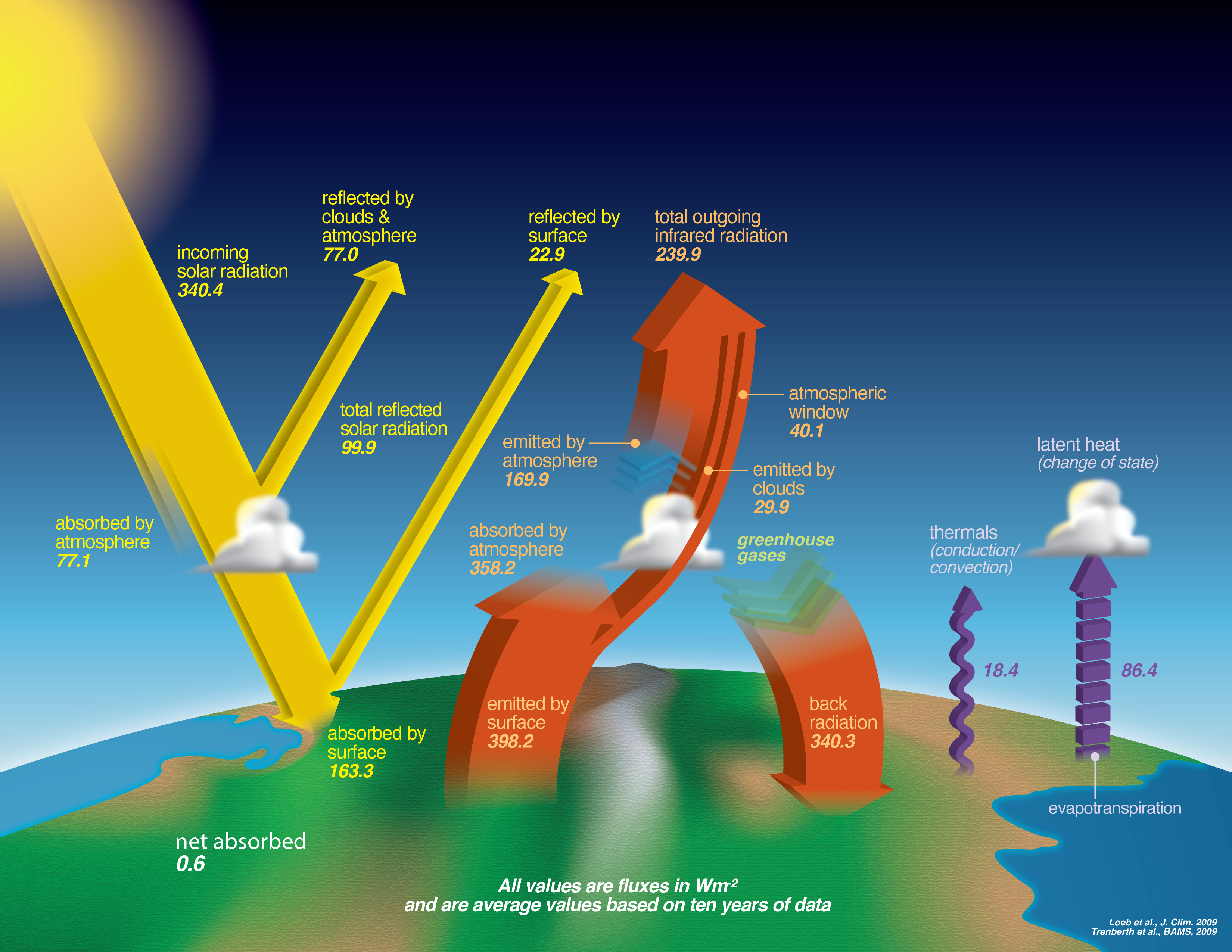 Il bilancio energetico della terra descrive i vari tipi e le quantità di energia che entrano e escono dal sistema terra. Esso include sia la componente radiativa (luce e calore) che altre componenti quali conduzione, evaporazione e evaporazione che possono trasportare calore dalla superfice terrestre. La quantità di energia in arrivo dal sole uguaglia la quantità di energia uscente (luce solare riflessa e emissione infrarossa). Crediti: NASA