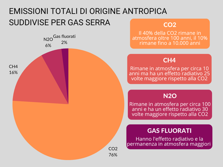 Emissioni totali di origine antropica suddivise per gas serra (Rielaborazione su dati IPCC 2014)