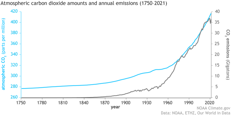 Emissioni e concentrazione atmosferica di CO2 dal 1750 al 2020 (Fonte: NOAA)